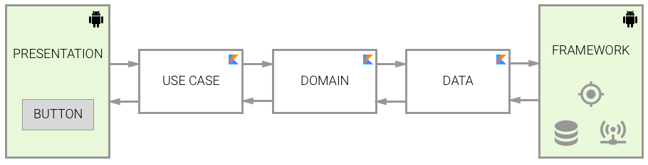 위의 그림처럼 Domain, Data, UI(presentation) 3 layer에 더해 Android Framework와 관련된 기능(알림, gps, 블루투스, 카메라등)을 포함한 Device또한 추가할 수 있습니다.