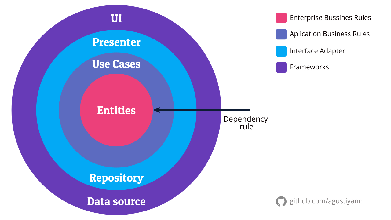 - domain layer : 비지니스 프로세스와 관련된 가장 핵심 계층. 어떤 다른 계층에도 독립적임. Entities, Use Case, Repository Interface등.