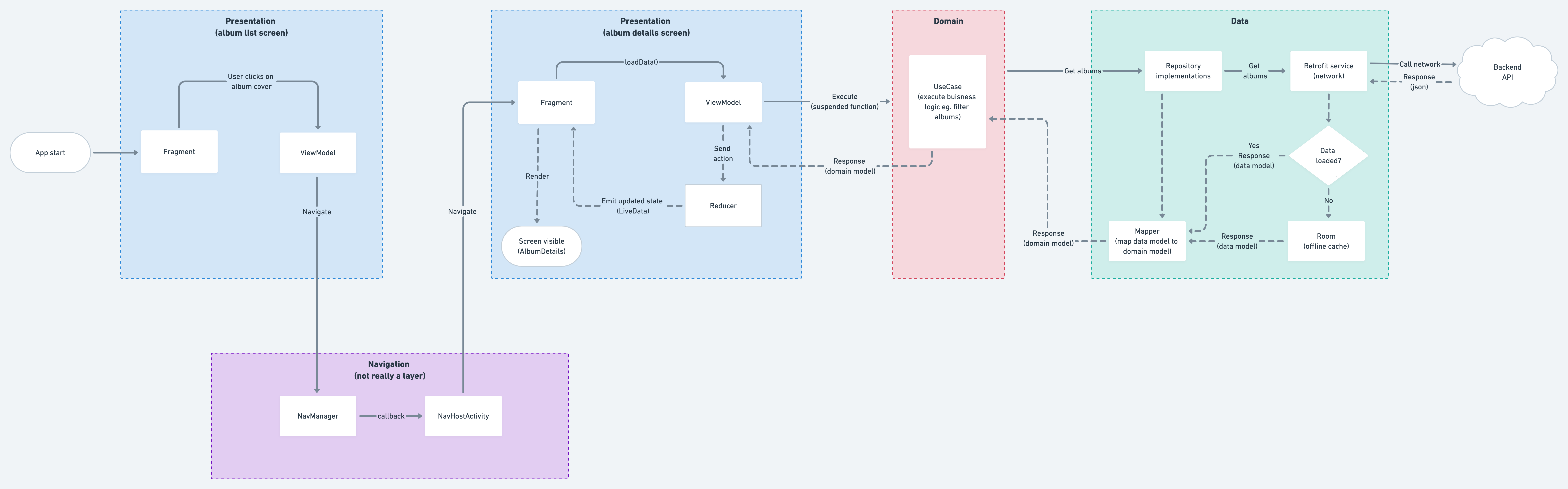 - data layer : 어플리케이션의 데이터 관리(네트워크에서 데이터 검색, 데이터 캐시 관리 등). Repository Implementation, Local & Remote Data source등.