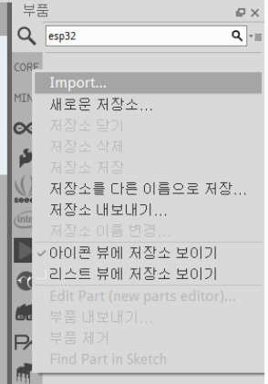 부품 메뉴에서 오른쪽 클릭 후, Import..를 클릭해서 저장한 fzpz파일을 불러와주세요.