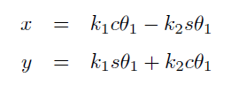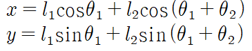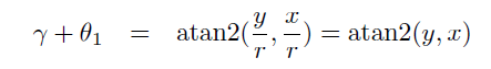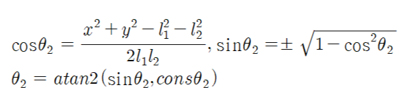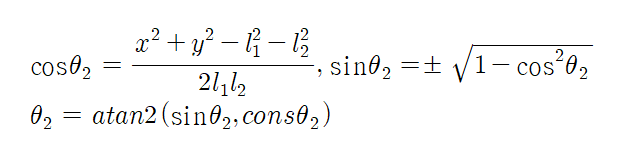 위 식을 역시 더하고, 스퀘어링하고, 나누고, 삼각함수 공식을 사용하면 Inverse Kinematics 식을 다음과 같이 구할 수 있습니다.