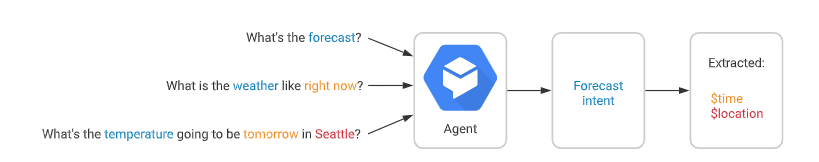 최종 사용자가 '예보는 어때?' 라고 말하면 Dialogflow는 최종 사용자 표현을 예보 인텐트와 일치시킵니다. 추출된 데이터는 시스템이 최종 사용자의 날씨 쿼리를 수행하는 데 중요합니다.