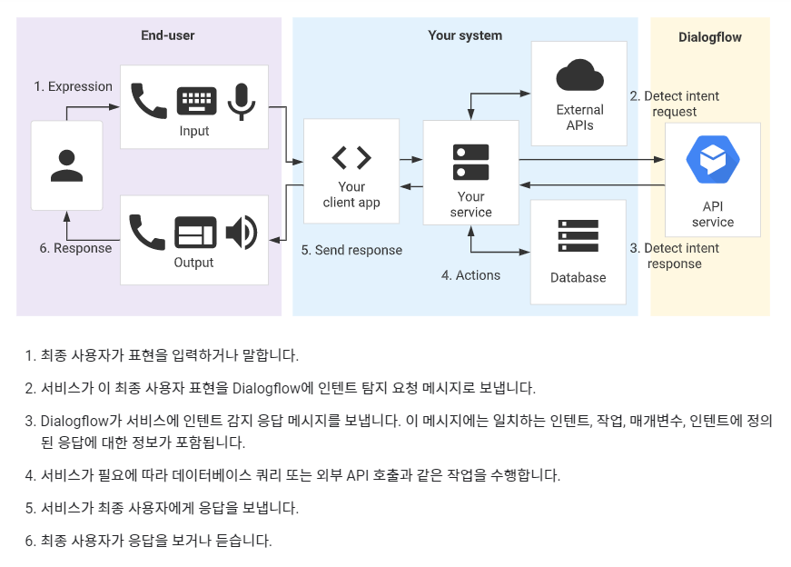 Dialogflow는 최종 사용자의 텍스트 또는 오디오를 앱이나 서비스가 이해할 수 있는 구조화된 데이터로 변환해줍니다.