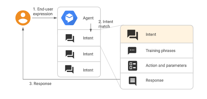 인텐트에는 학습 문구, 작업, 매개변수, 응답이 포함됩니다.