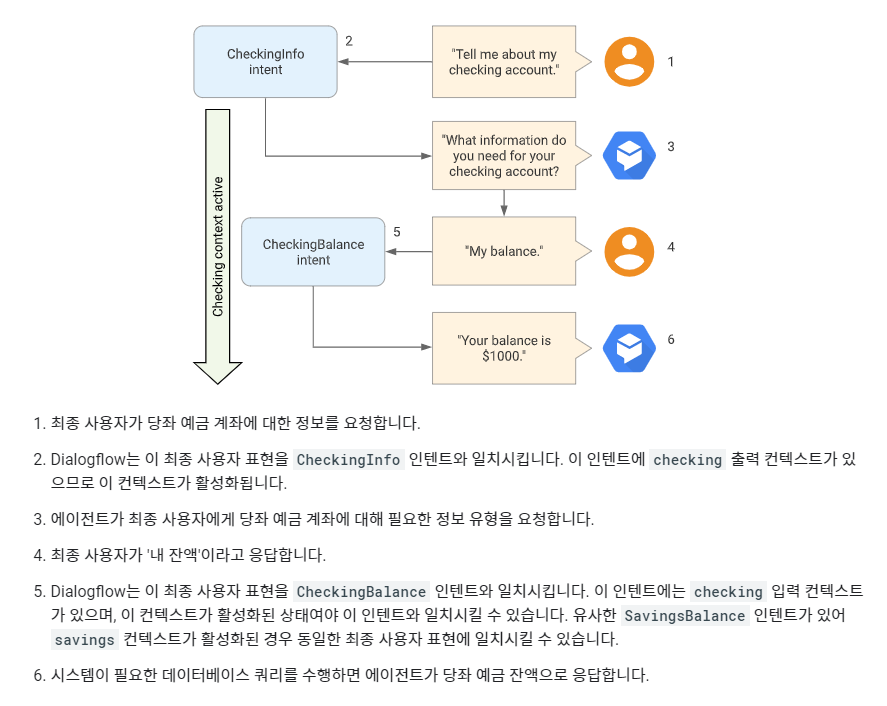 컨텍스트를 사용하여 대화의 흐름을 제어할 수 있습니다. 문자열 이름으로 식별되는 입력 및 출력 컨텍스트를 설정하여 인텐트의 컨텍스트를 구성할 수 있습니다. 인텐트가 일치하면 해당 인텐트에 대해 구성된 출력 컨텍스트가 활성화 됩니다. 활성화된 컨텍스트가 있으면 Dialogflow는 현재 활성화된 컨텍스트와 일치하는 입력 컨텍스트로 구성된 인텐트만 일치시킵니다.