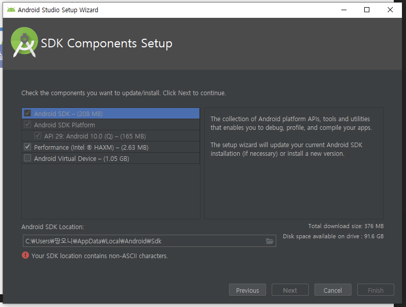 SDK 설치 창이 뜨는데요. Location이 경로 중간에 한글이 있어 빨간 느낌표가 뜨죠